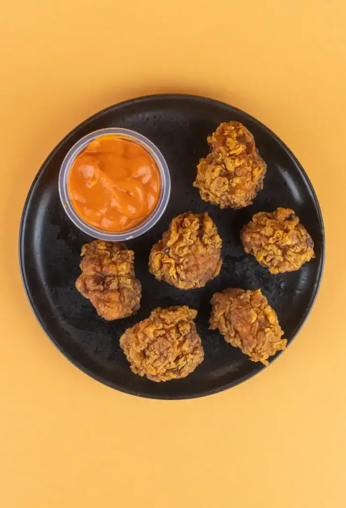 hourCrispy and spicy chicken bites coated in a flavorful seasoning, served with a spicy sauce. Perfect for a tasty appetizer or snack.