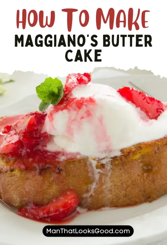 Maggiano’s Butter Cake is a sweet dessert served at Maggiano’s restaurants. It’s a delicious butter cake made with easy-to-find ingredients like softened unsalted butter, granulated sugar, eggs, vanilla extract, all-purpose flour, baking powder, salt, and whole milk. Topped with a little bit of powdered sugar, fresh strawberries, and a dollop of whipped cream.
